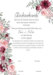 Für Ihre freie Trauung bereite ich gern Ihre persönliche Glücksurkunde vor. Diese wird dann auf hochwertigem 200 gr. Papier gedruckt und dient als schöne Erinnerung an Ihren großen Tag. Diesen Service berechne ich mit 10€.