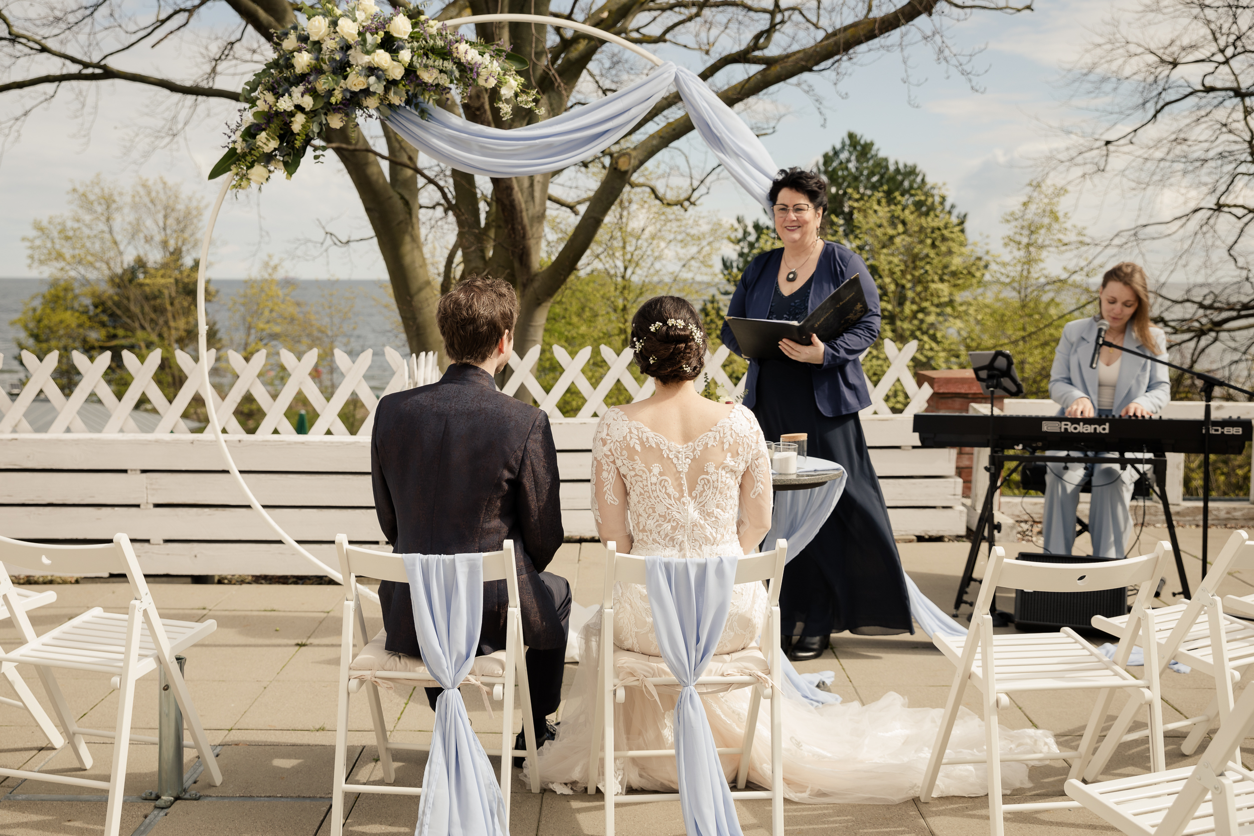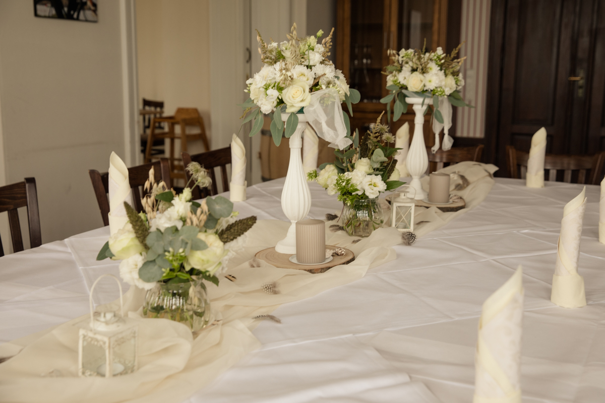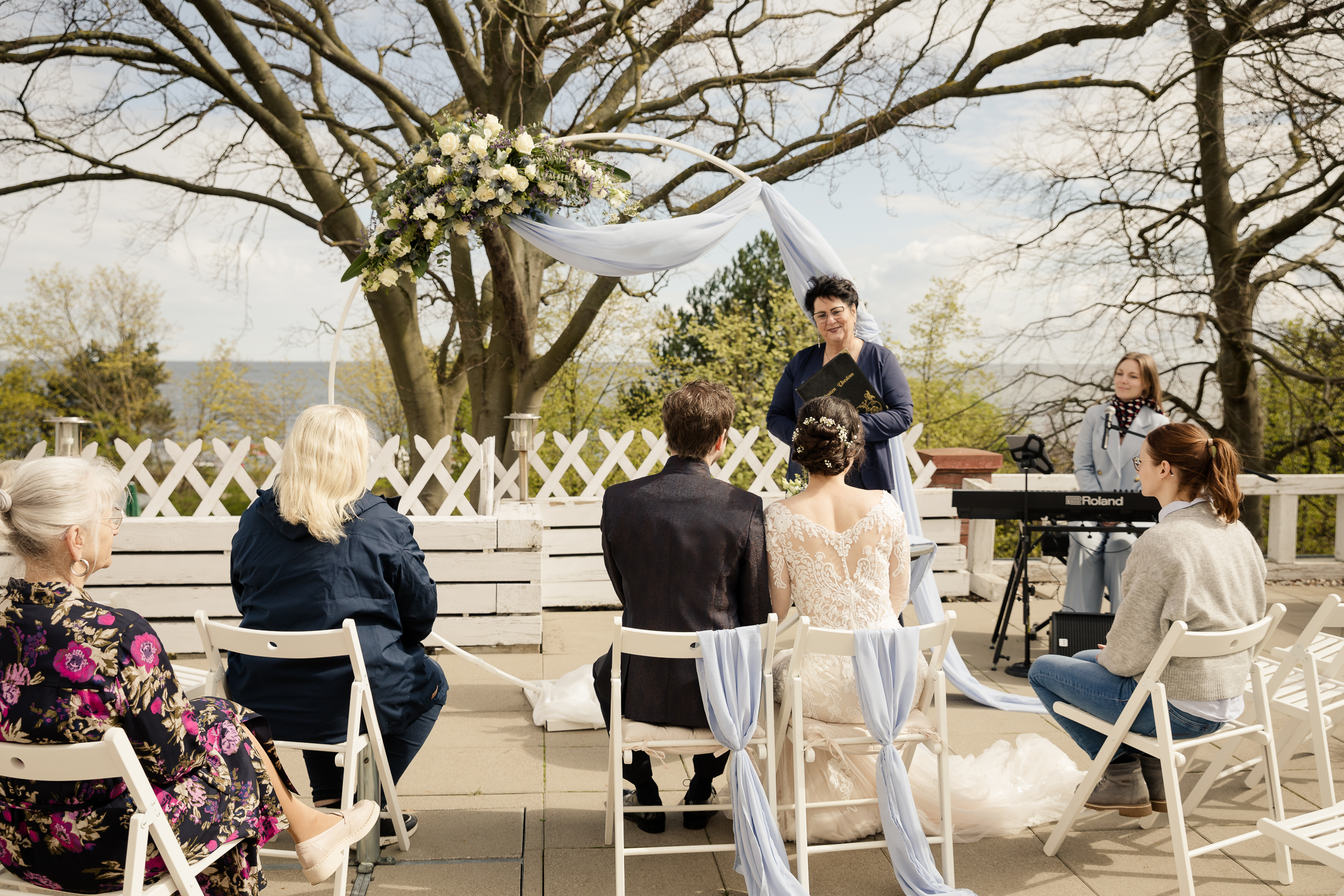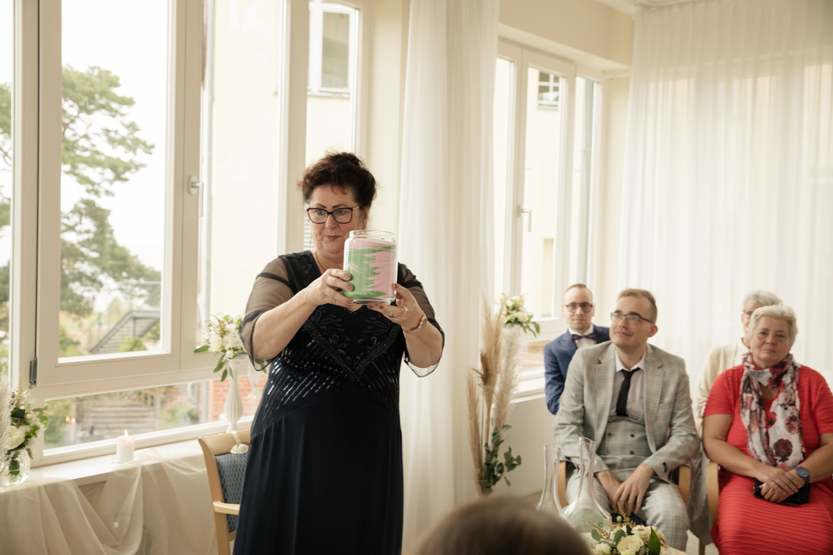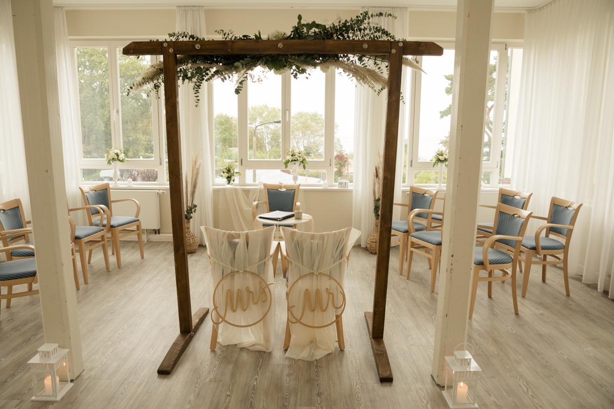 Die Strandvillen in Heringsdorf sind perfekt für kleinere Hochzeitsgesellschaften. Der Trauraum im Hotelanbau bietet Platz für 18 Personen und gewährt einen direkten Blick auf die Ostsee. Im Anschluss an die freie Trauung, kann man sich so richtig verwöhnen lassen bei einem Sektempfang mit hochwertigen Canapés auf der Sonnenterrasse. Für die Dekoration des Trauzimmers (Traubogen, Kerzen, Stuhlschmuck, Tischdekoration), empfehle ich Frederike Kracht von art of lovely moments. Für Menüwahl, Zimmerbuchung und Terminorganisation steht Ihnen Frau Hannemann von den Strandvillen zur Verfügung.
